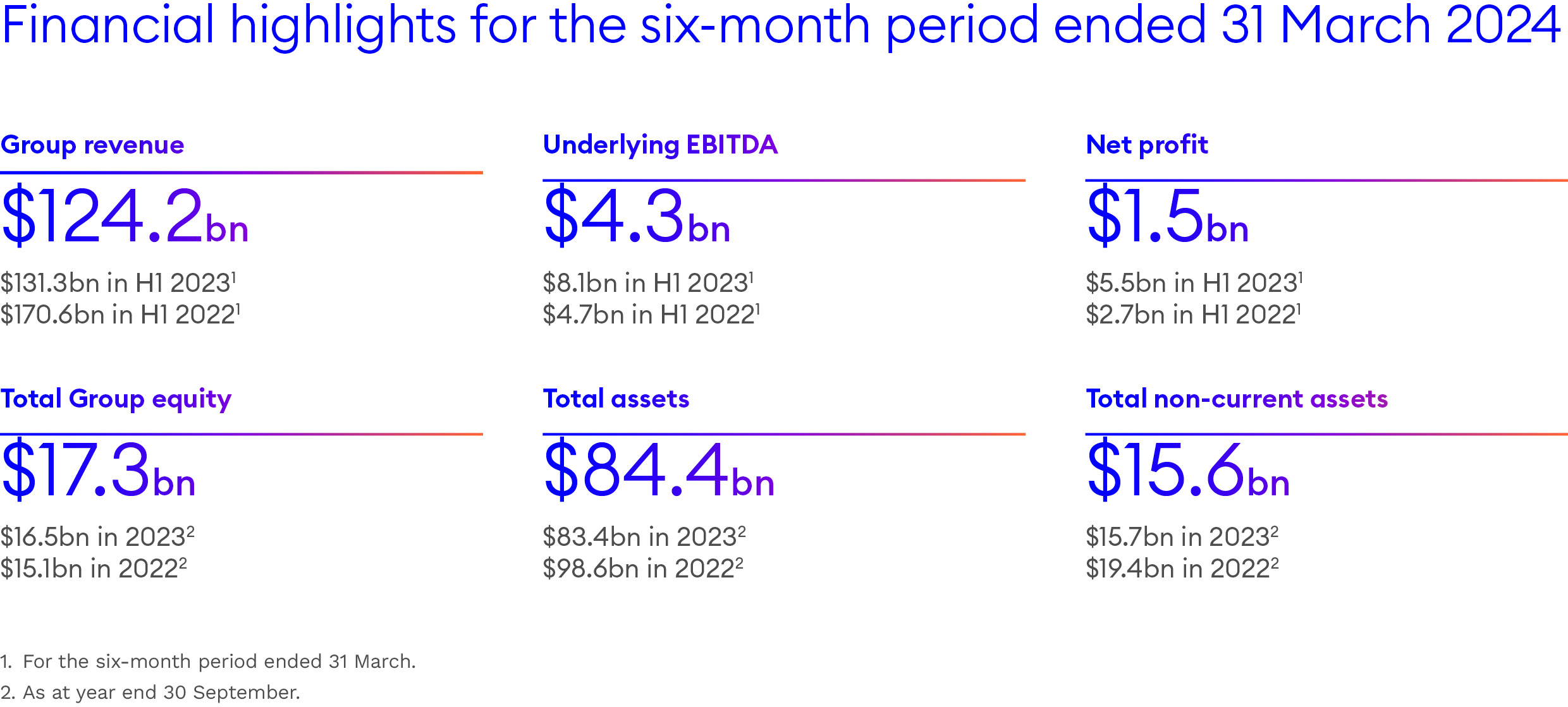 The six months to the end of March of 2024 saw a continuation of the less turbulent conditions that prevailed during the second half of the 2023 financial year. Revenue fell five percent to USD124,197 million, reflecting the impact of lower commodity prices, partially offset by higher trading volumes. The Group reported underlying earnings before interest, tax, depreciation and amortisation (EBITDA) of USD4,284 million compared to USD8,136 million in 2023. The solid performance in the first half of 2024 demonstrates the Group's ability to adapt to changing market dynamics.